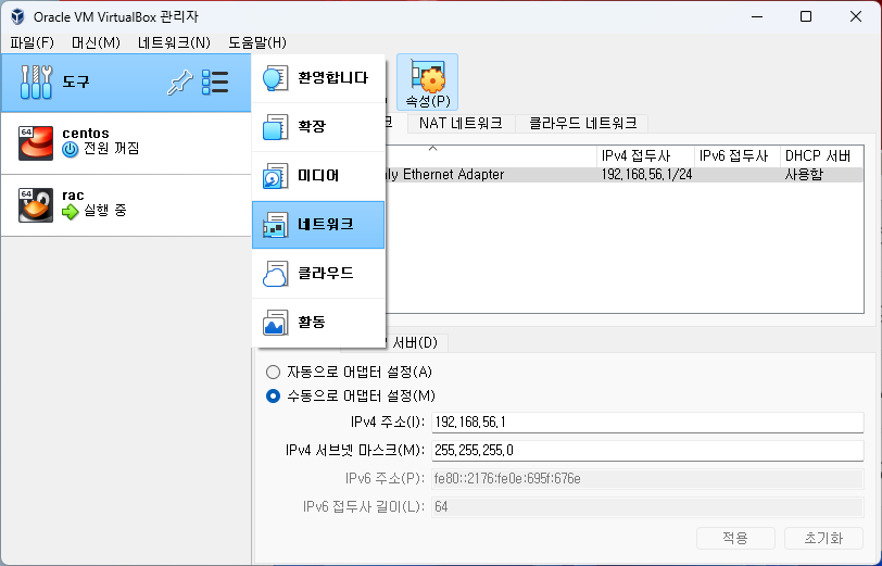 1 퍼블릭 > edit > ipv4 > manual config... > 192.168.56.101 / 255.255.255.0