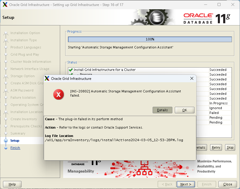 # [INS-20802] Automatic Storage Management Configuration Assistant failed.