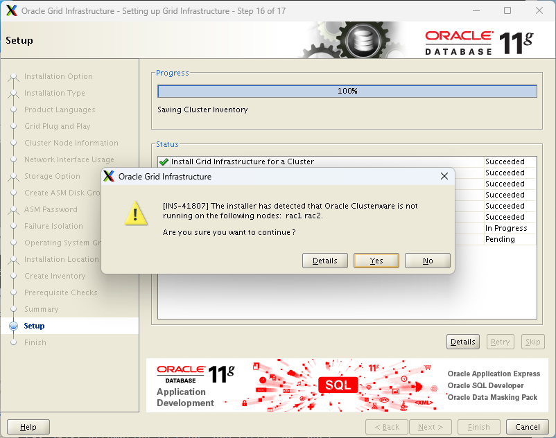 # [INS-41807] 설치 프로그램이 Oracle Clusterware가 rac1 rac2 노드에서 실행되고 있지 않음을 감지했습니다.