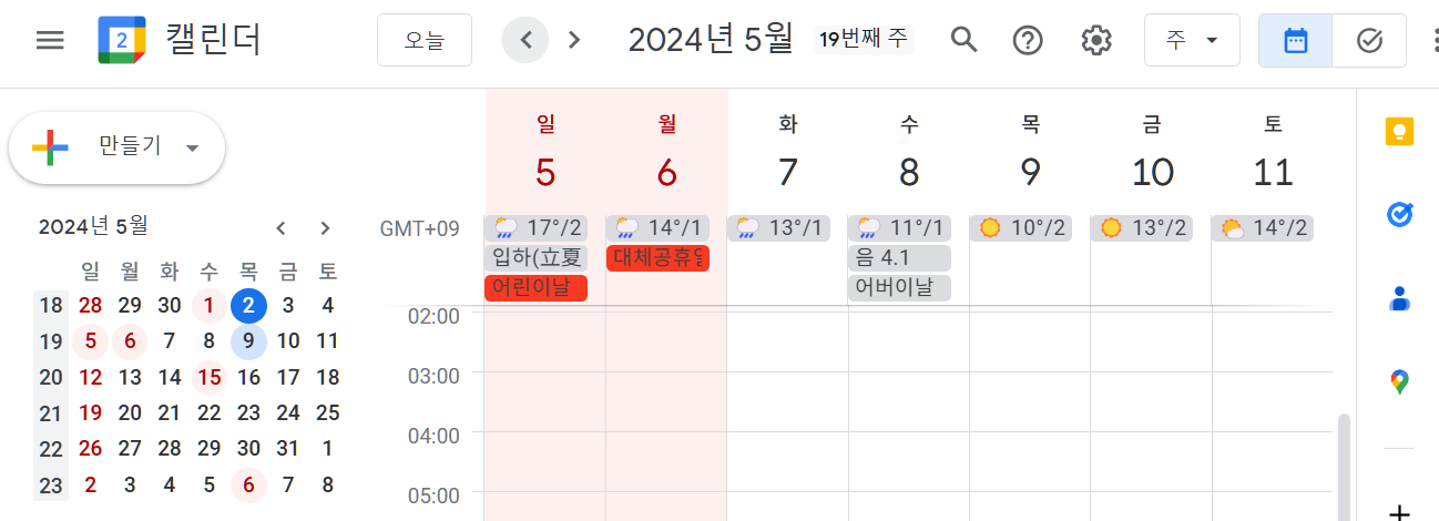 - PC버전의 구글캘린더 내 요일별 색상 표시