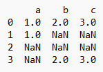 df = DataFrame(data = [[1,2,3],[1,None,np.NaN],[np.nan,NA,NA],[NA,2,3]], columns=['a','b','c'])