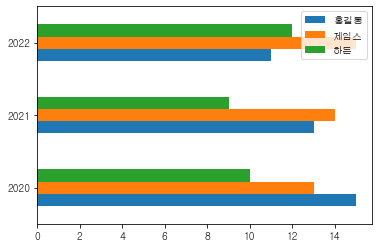 | df['홍길동'].plot(kind='bar') df['홍길동'].plot(kind='barh') > 1개 칼럼 |