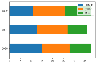 # 스택형 막대그래프 df.plot(kind='bar', stacked=True) df.plot(kind='barh', stacked=True) > 다수 칼럼 누적형 |