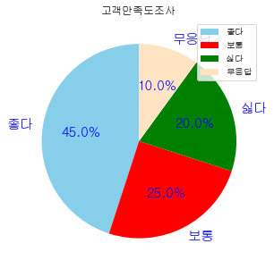 | survey.frequency.plot(kind='pie', colors=['skyblue','red','green','bisque'], autopct='%.1f%%', # 부채꼴 안에 표시될 숫자 형식 label='', title='고객만족도조사', fontsize = 15, legend=True, # 범례 figsize=(7,5), # 가로길이, 세로길어 startangle=90, textprops={'fontsize':10,'color':'blue'} # 글자 ) |