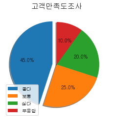 | plt.pie(survey['frequency'], shadow=True, startangle=90, autopct='%.1f%%', explode=(0.1,0,0,0)) plt.legend(labels=survey.index, loc='lower left') plt.title('고객만족도조사', size=15) |