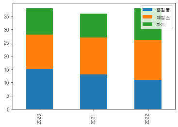 | # 스택형 막대그래프 df.plot(kind='bar', stacked=True) df.plot(kind='barh', stacked=True) > 다수 칼럼 누적형 |