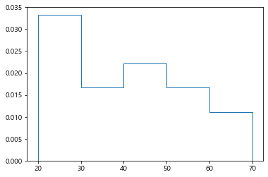 | plt.hist(ages, bins=bins, density=True, histtype='step') | ![]() |
