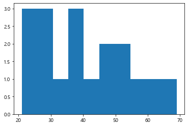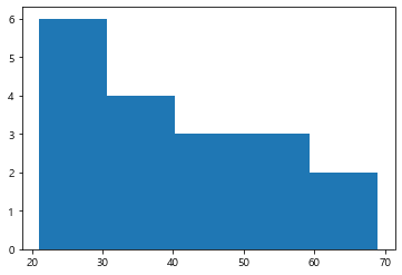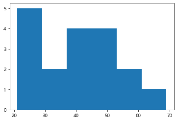 | plt.hist(ages, bins=5) # bins=5 : 5개 구간 | ![]() |