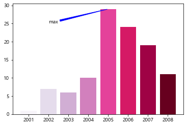 | plt.bar(x=years.index, height=years, color=colors) plt.annotate(text='max', xy=(2005,29), xytext=(2002,25), arrowprops={'arrowstyle':'wedge', 'facecolor':'red','color':'blue'}) |