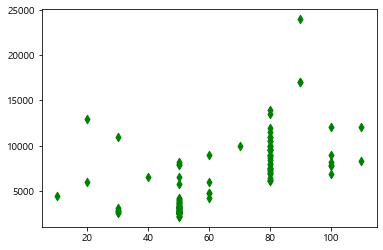 | plt.scatter(emp['DEPARTMENT_ID'], emp['SALARY'], marker='d', facecolor='g') - marker : 모양 : v(역삼각형), s(스퀘어), d(다이아몬드), ... |