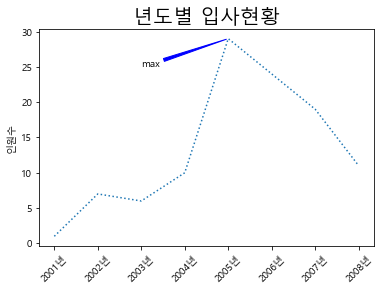 | # matplotlib_bar plt.plot(years.index, years, linestyle=':') plt.xticks(ticks=years.index, labels=[str(i)+'년' for i in years.index], rotation=45) plt.xlabel('') plt.ylabel('인원수', size=10) plt.title('년도별 입사현황', size=20) plt.annotate(text='max', xy=(2005,29), xytext=(2003,25), arrowprops={'arrowstyle':'wedge', 'facecolor':'red','color':'blue'}) plt.show() |