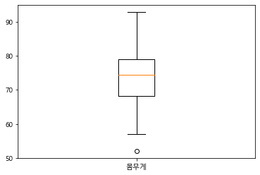 | plt.boxplot(weight, labels=['몸무게']) | ![]() |