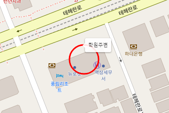 | m = folium.Map(location = [latitude, longitude], zoom_start = 18) folium.CircleMarker(location = [latitude, longitude], color = 'red', radius = 30, tooltip = '학원주변').add_to(m) m.save('C:\\data\\seoul.html') # 파일로 저장 |
