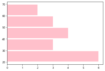 | plt.hist(ages, bins=bins, orientation='horizontal', color='pink', rwidth=0.9) | ![]() |