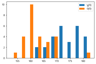 | plt.hist([height['남자'], height['여자']], label=['남자','여자']) plt.legend() |