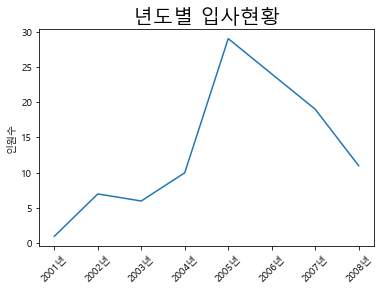 | # pandas years.plot() plt.xticks(ticks=years.index, labels=[str(i)+'년' for i in years.index], rotation=45) plt.xlabel('') plt.ylabel('인원수', size=10) plt.title('년도별 입사현황', size=20) plt.show() |