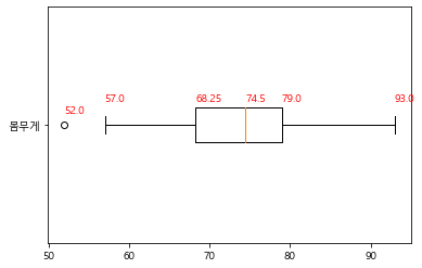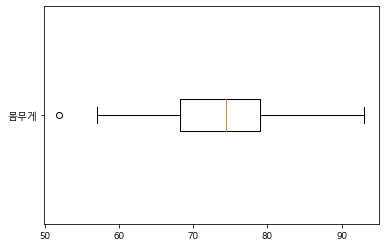 | plt.boxplot(weight, labels=['몸무게'], vert=False) | ![]() |