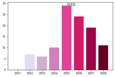 | # pandas_bar plt.bar(x=years.index, height=years, color=colors) plt.text(2005,29,'최대값') |