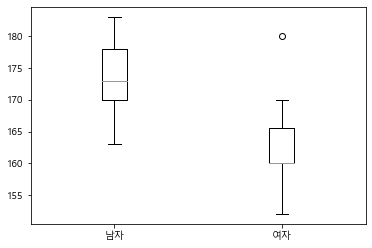 | plt.boxplot([height['남자'], height['여자']], labels=['남자','여자']) | ![]() |